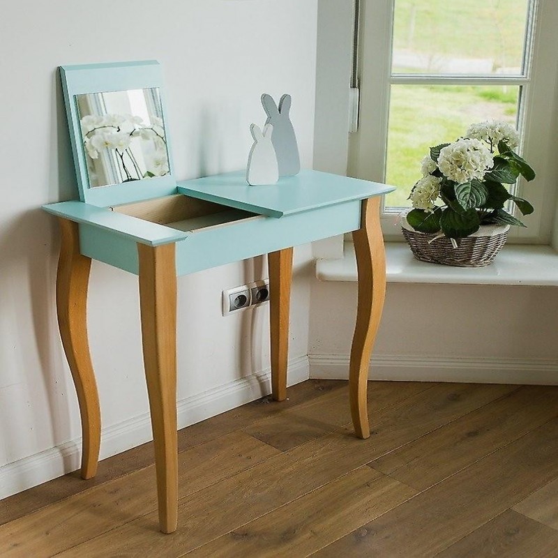 Il tavolo da toeletta è realizzato in legno di faggio e MDF laminato e laccato. Questo lo rende non solo un mobile dal design accattivante, ma anche un prodotto durevole. Le gambe colorate sono rifinite in un elegante colore nero e il piano del tavolo ha uno spessore di 19 mm, conferendogli un aspetto robusto e solido.