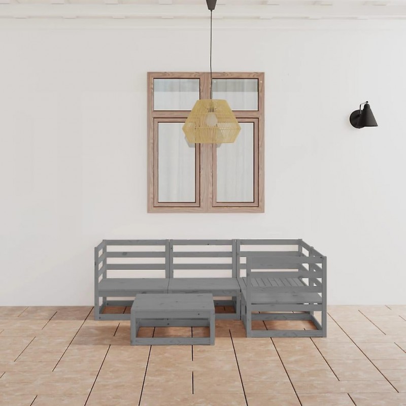 Colore: Grigio Materiale: Legno massello di pino Dimensioni divano centrale/angolare (ciascuno): 70 x 70 x 67 cm (L x P x A) Dimensioni tavolo: 70 x 70 x 30 cm (L x P x A) Assemblaggio richiesto: Sì Capacità di carico massima (per seduta): 110 kg La consegna include: 3 sezioni di divano angolare, 1 sezione di divano centrale, 1 tavolo